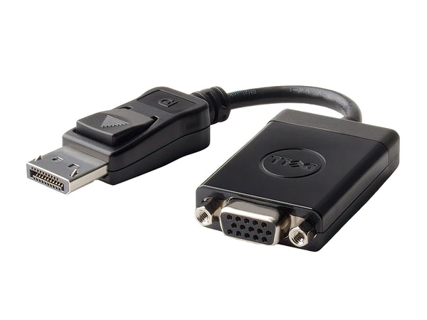 The Dell DisplayPort to VGA Adapter (05KMR3) features a DisplayPort connector on one end and a 15-pin HD15 VGA connector on the other. This setup allows for quick and easy connections between DisplayPort devices and VGA displays. The adapter is a standard fit for a wide variety of VGA-compatible display monitors, projectors, and HDTVs, ensuring versatile use across different professional environments.